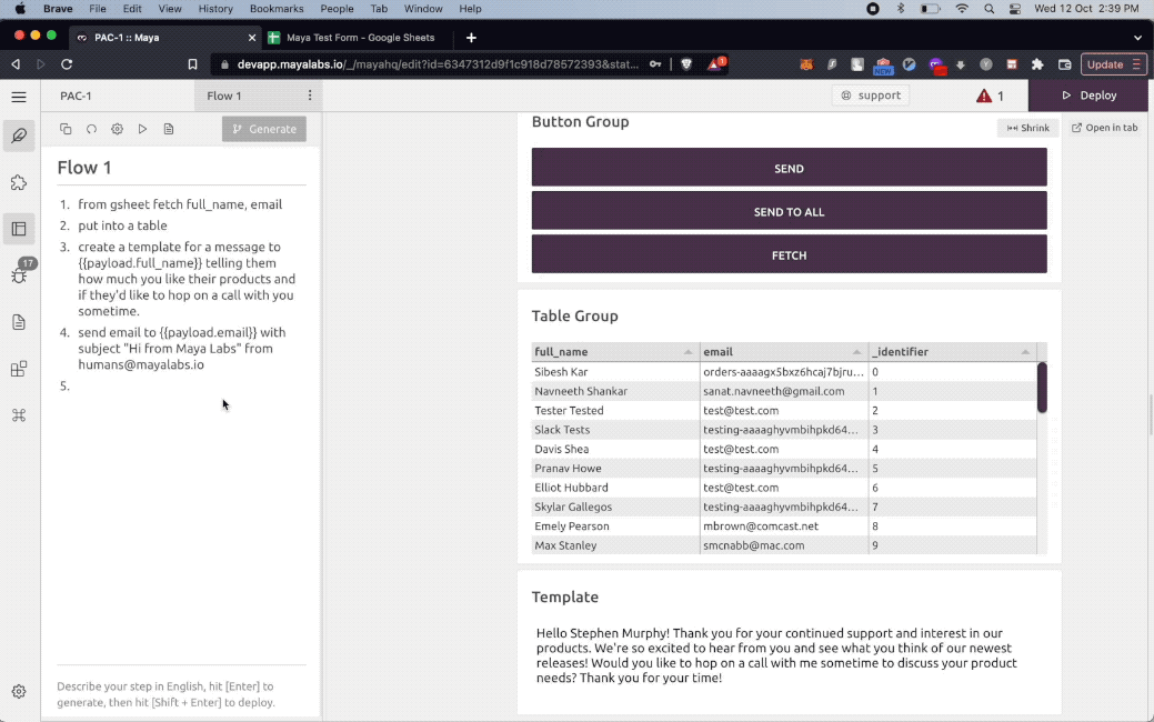 PAC-1 can be taught and interpret to scripts of arbitrary complexity and length, extending to complex business processes. For instance, the script below automates a sales process of fetching leads from a google sheet, researching them on the web, composing blurbs to place in the mails based on some email templates it's been shown before.