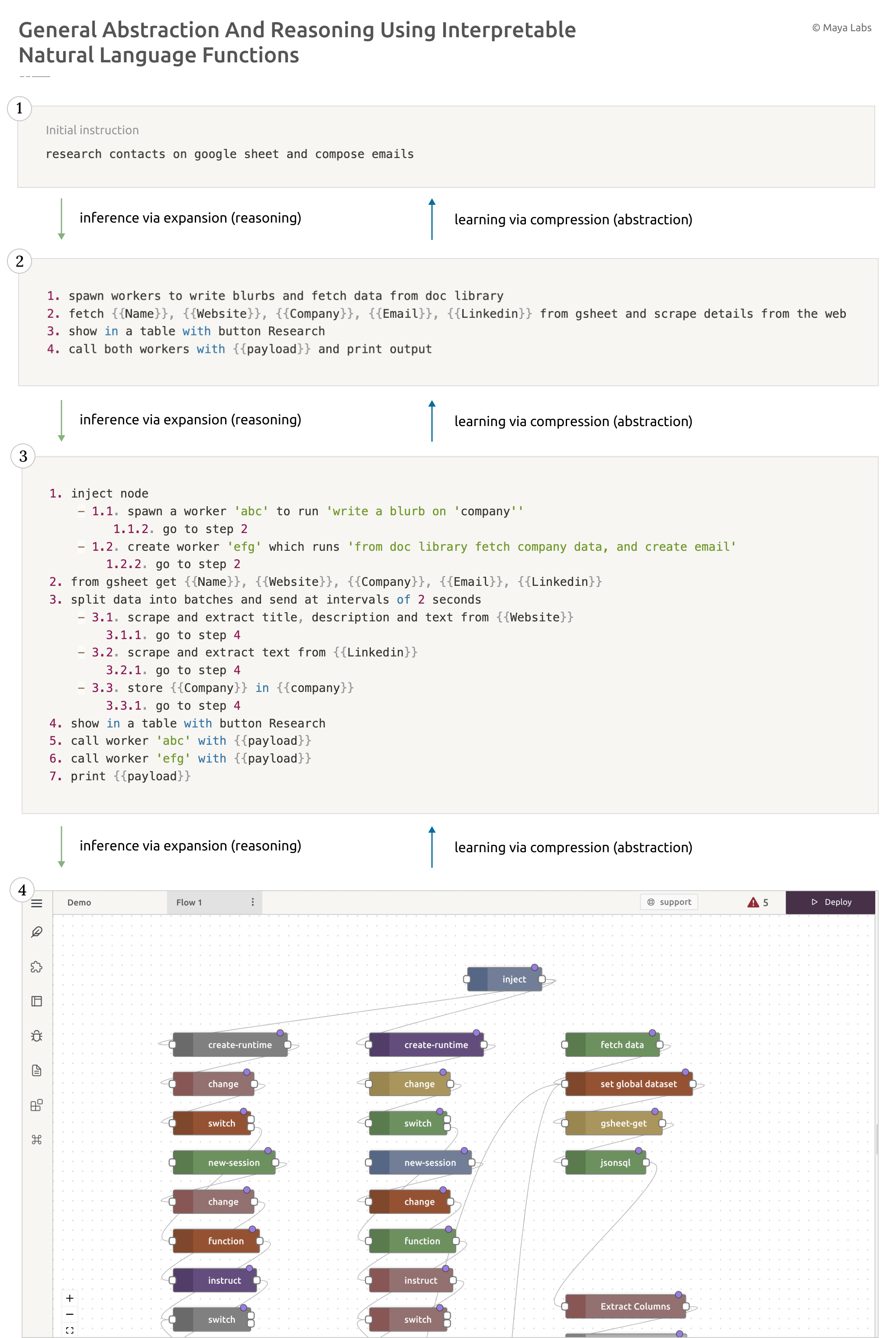 This new way of programming a machine in natural language means we can treat natural language as a functional LISP-like symbolic language, allowing for causal modelling of concepts in hierarchies, like a software parse tree. Instructions given at a high-level can trickle down to lower levels, allowing for granular control and coordination with fleets of machine 'workers' collaborating together at each level - in parallel, or as an assembly line. We can now view the 'learning process' as abstraction via repeated compression, and 'inference' as reasoning via repeated expansion, as shown in Fig 10 (below).